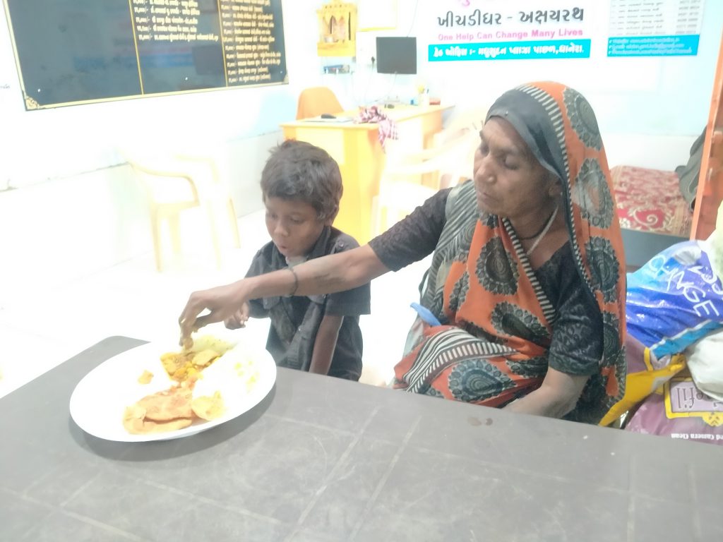 Beggars, Monks, Office workers, Factory staff, Hospital patients, and their relatives have been benefited by this Khichadi Ghar project. Everyday approximately 250 people take advantage of this project. We serve Khichdi Kadhi, Puri / Chapati / Bhakri-Shaak, Dal-Bati in meals in lunch time between 11:30 a.m. to 2:30 p.m. and in dinner time between 6:30 p.m. to 9:00 p.m. Free meals are provided to the old age people , children and no income group families residing in huts.